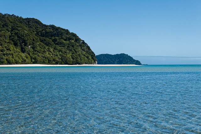 Back to Motueka from Golden Bay you have to climb Takaka Hill, 800m, and to start your track in Marahau another little hill, 250m, has to be crossed. Old Mac Donald has a farm in Marahau, a good place to store your bike in a shed at that camp site. About 4 hours walk along the coast on a very good and pleasant track to Torrent Bay, which can only be crossed within 2 hours of low tide. Another 3 hours to Barks Bay with space for about 40 tents and a wonderful sandy beach to swim. If you start early (6 o'clock) you have the track for yourself for a few hours. Up and down, through jungle and long sandy beaches you reach Awaroa Inlet, where you have to wait for low tide again. Another 2 hours to Totaranui, where you can catch a water taxi (small boat for 10 people max.) back to Maharau. It is a bit of a nuisance, that you have to carry your tent, sleeping bag, mattress, cooker, food etc just for one night in your tent. With good weather one of the best two days I ever had in a walk. You will meet quite a few people, 'you never walk alone'.